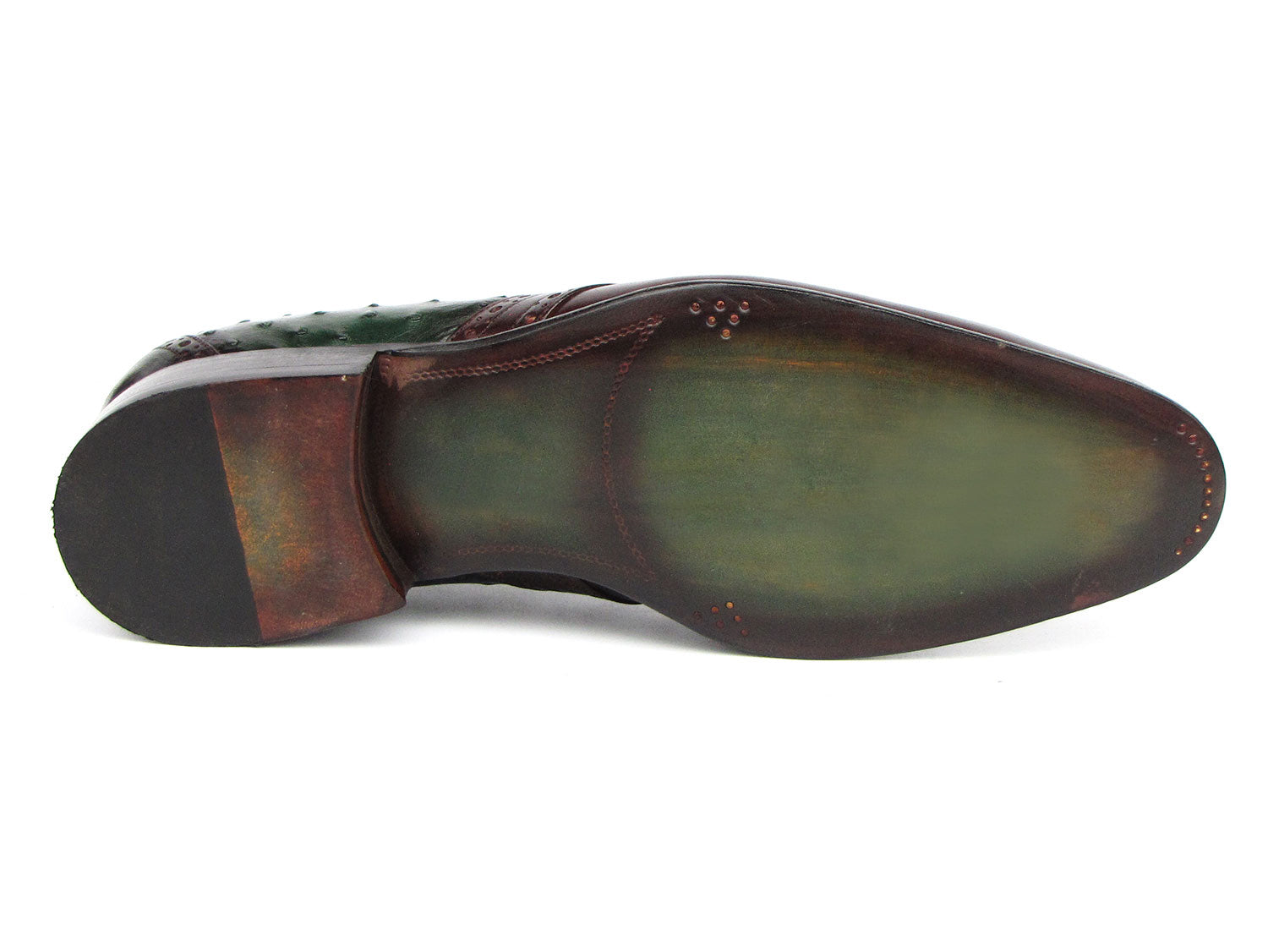 - Green ostrich and brown leather upper.
