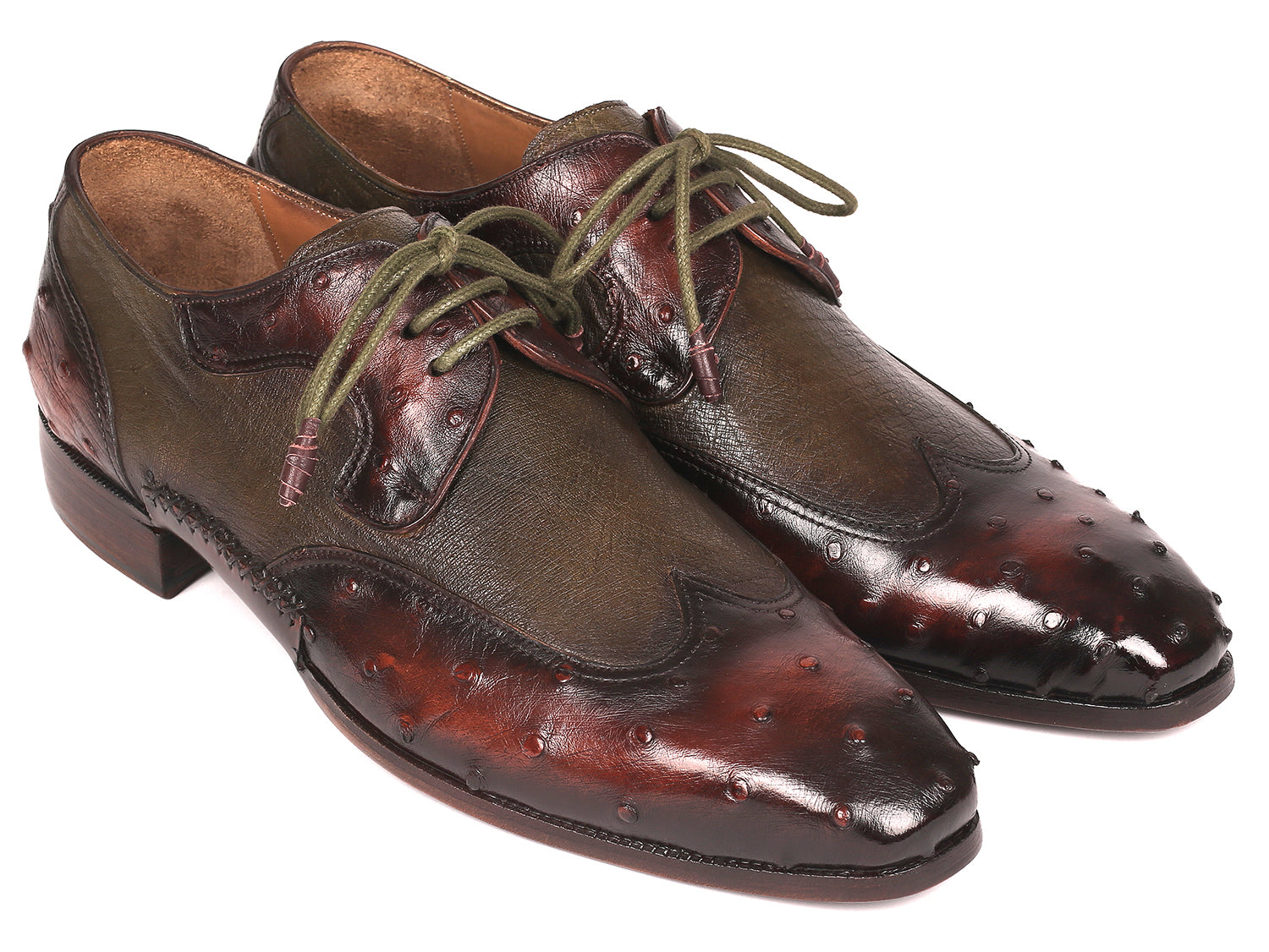 Paul Parkman Ostrich Skin Wingtip Derby Shoes Brown & Green (ID#844H389)